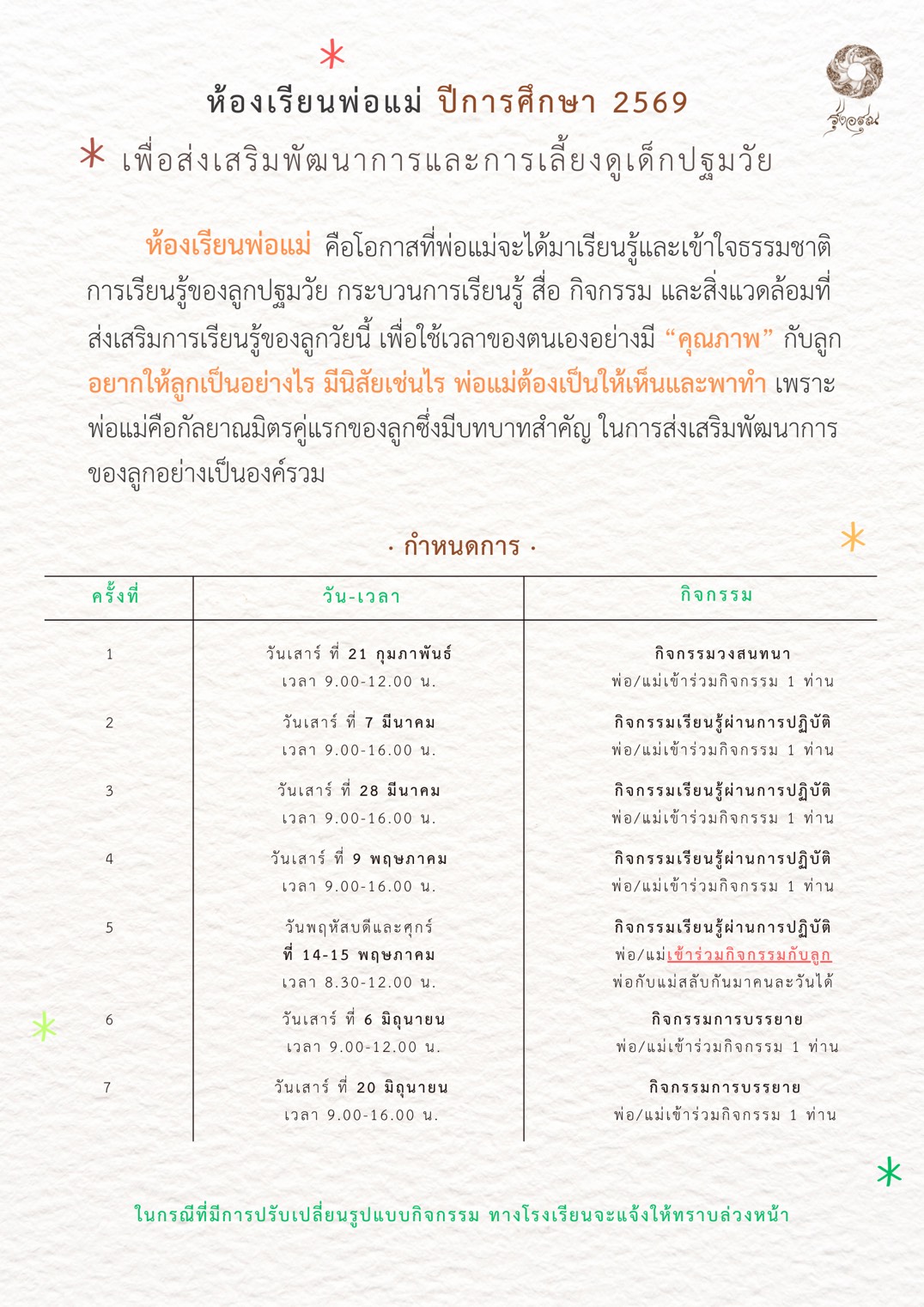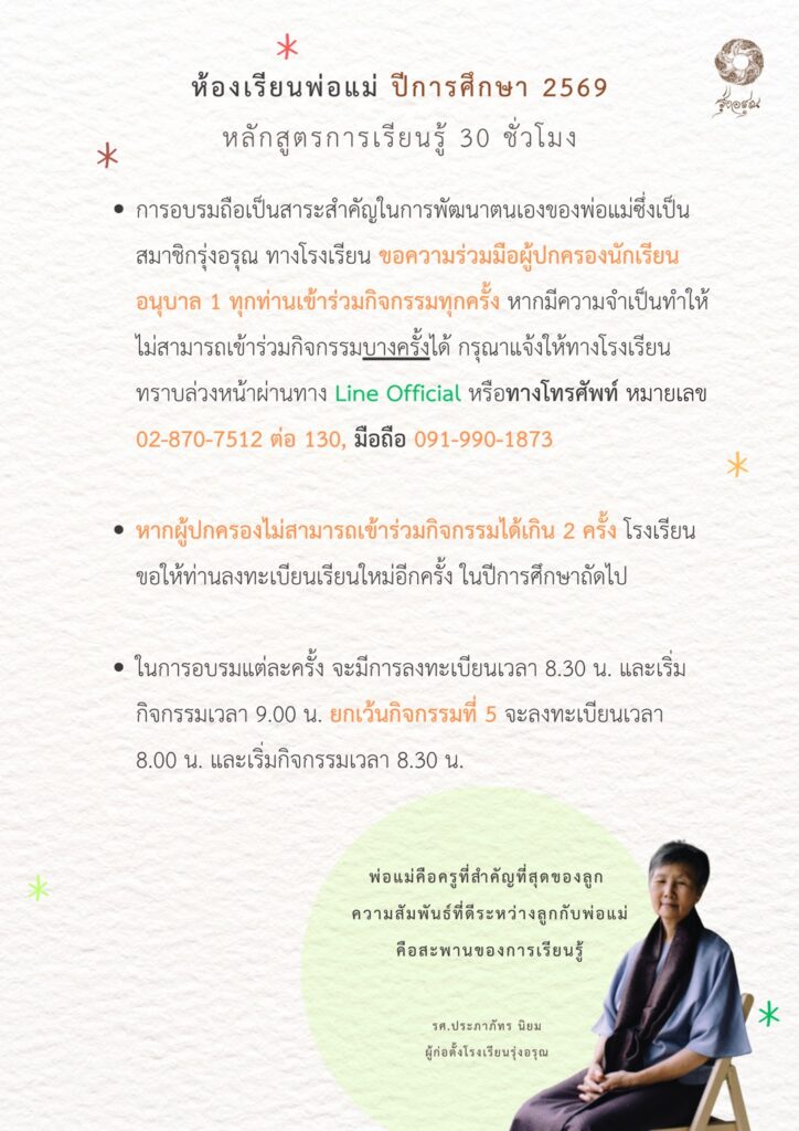 Uncategorized ห้องเรียนพ่อแม่ ปีการศึกษา 2569 January 21, 2026 Previous เปิดรับสมาชิกใหม่สู่ครอบครัวรุ่งอรุณ Newer ประกาศรายชื่อนักเรียนที่ผ่านการคัดเลือกเข้าเรียน ระดับชั้นมัธยมศึกษาปีที่ 1 ปีการศึกษา 2569